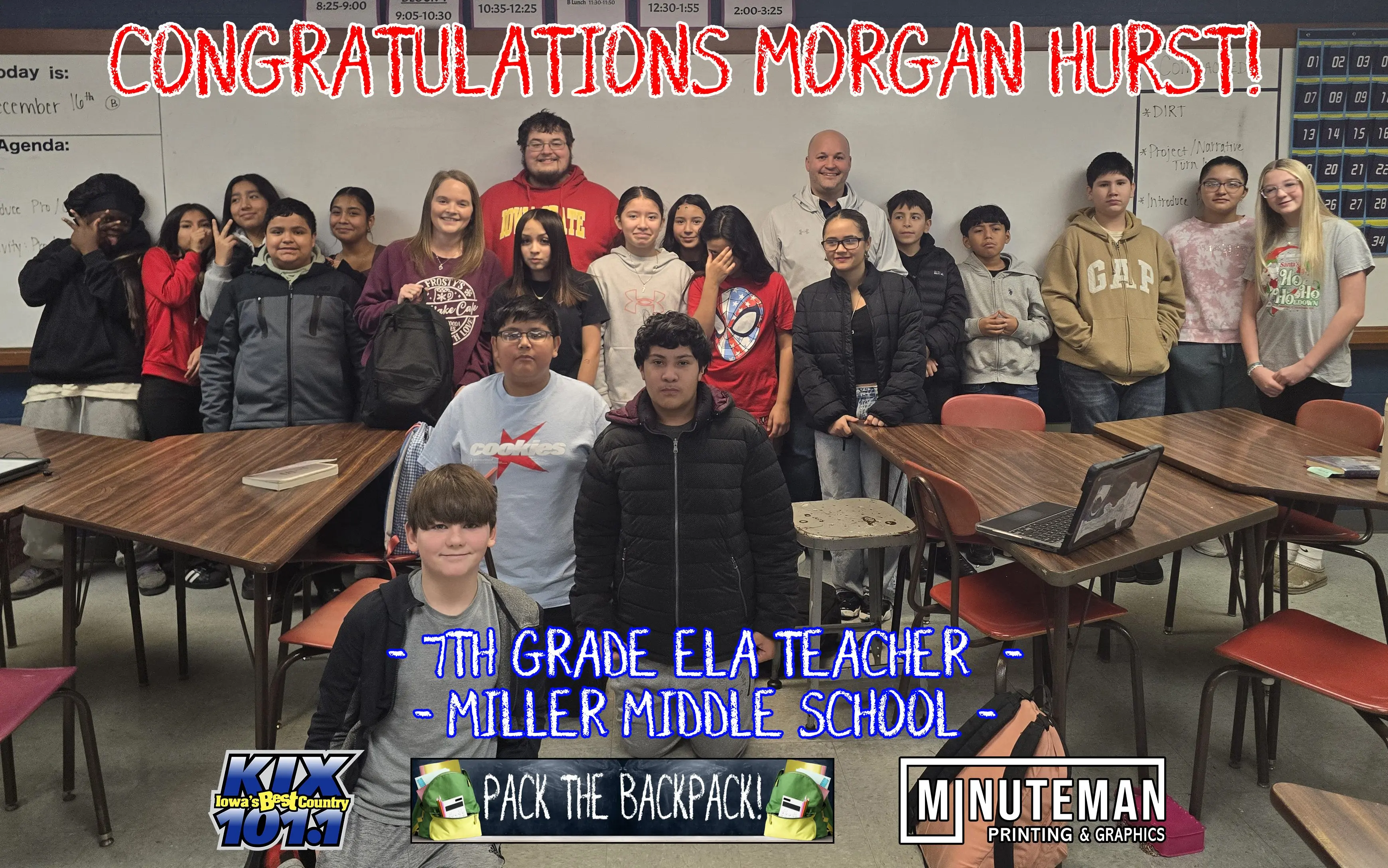 The December Minuteman Printing & Graphics Pack the Backpack winner, is Morgan Hurst – 7th Grade ELA Teacher @ Miller Middle School in Marshalltown. She was nominated by Bub Hurst, and here is what they wrote to Kix 101.1.